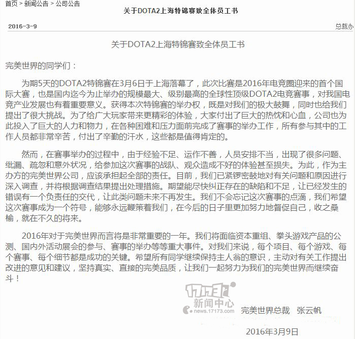 在完美世界的官方公告中,完美世界承认在赛事举办过程中,由于经验不足、运作不善,人员安排不当,出现了很多问题、纰漏、疏忽和意外状况。并愿意承担起全部责任,对有关问题和原因进行深入调查完美回应DOTA2上海特锦赛事件:承担全部责任。