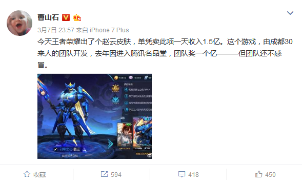 知名财经博主曹山石曾在微博透露,王者荣耀出了个赵云皮肤,单凭卖此项一天收入1.5亿。