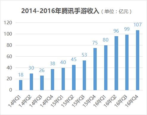 从财报来看,2016年四季度腾讯手游业务收入达107亿元,同比增长51%。
