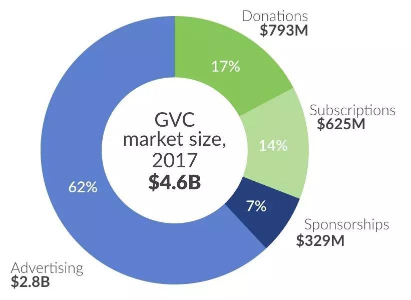 根据SuperData的测算,2017年游戏视频平台的收入总量将达到46亿美元,其中62%的收入来自广告,打赏、捐赠的份额为7.9亿美元,占比为17%;订阅份额为6.25亿美元,占比14%。和国内游戏直播中主播收入主要来自签约费和打赏分成有所不同,SuperData中统计的广告收入中有的来自平台在视频植入硬广中与主播的分成,在伽马数据看来,类似的商业模式或可为国内平台借鉴。