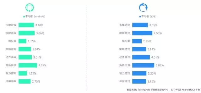 而另据TalkingData今年3月的移动游戏报告,当前手游中付费率最高的是RPG类游戏,不过其平均付费率也只有4.2%(Android平台)/5.0%(iOS平台),游戏视频产业的用户付费率达到了手游的9'10倍。