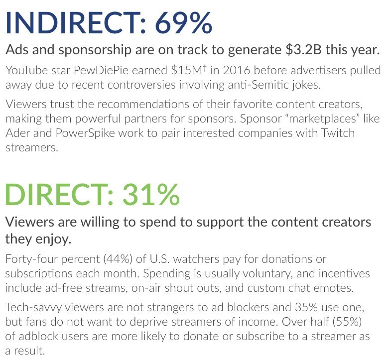 另一方面,观众也乐于对喜欢的主播或游戏内容打赏、捐赠或订阅。仅从美国来看,约有44%的观众每个月都会付费捐赠/订阅,这种消费行为大多是自发的,并且包括对无广告视频的付费。