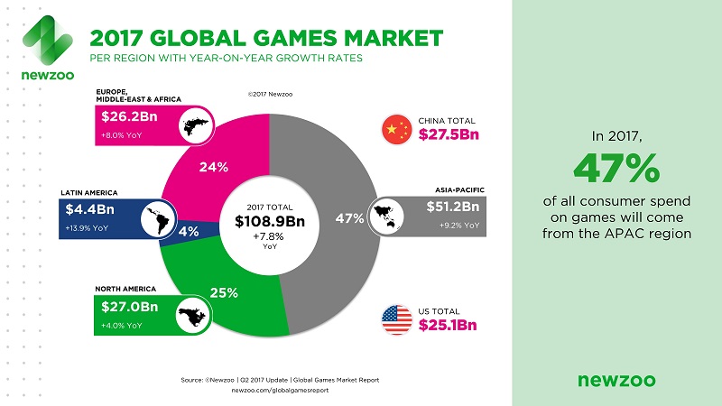 2017年中国游戏市场收入预计275亿美元,贡献全球1/4的收入