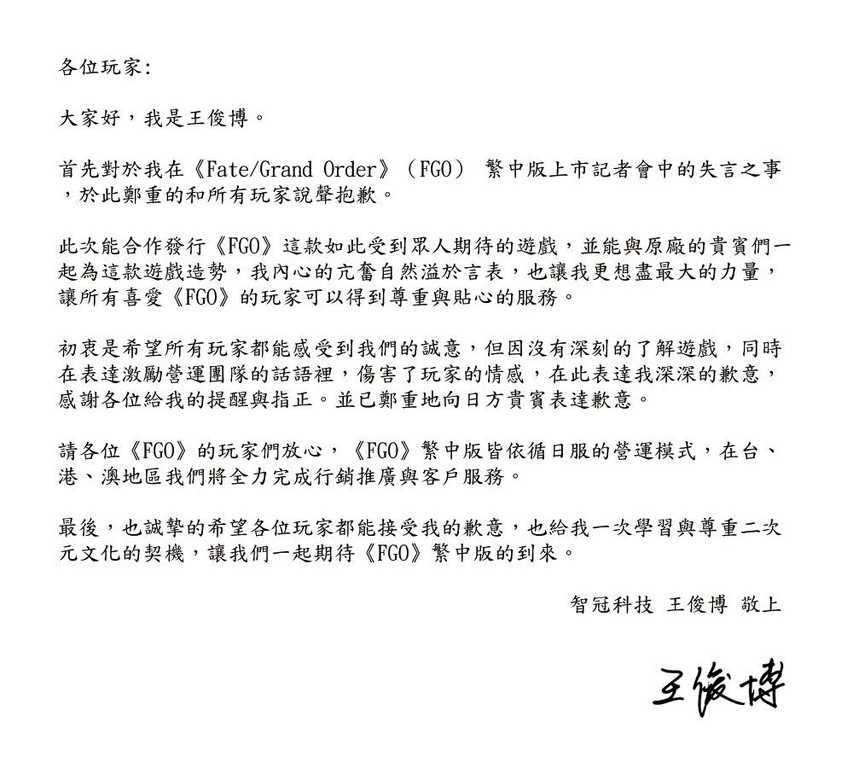 事后王俊博也通过Mycard粉丝团发出声明,并在声明当中为当日失言引发的争议致歉,表示最出初衷是希望能让玩家感受到诚意,但因不够了解游戏,导致会中为激励运营团队所说的话语,伤害了玩家的情感,对于外界给予的提醒与指正表示感谢,同时也对日方代表表示歉意,并且在最后提到“诚挚的希望各位玩家都能接受我的歉意,也给我一次学习与尊重二次元文化的契机,让我们一起期待《FGO》繁中版的到来”。