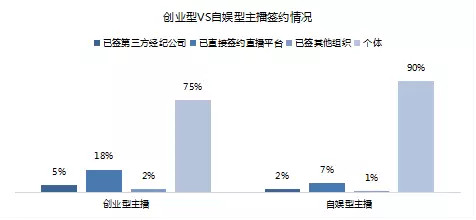 创业型主播和自娱型主播,在签约情况上存在明显的差异。对于创业型主播,高达25%的比例选择通过与直播平台、第三方经济公司/工会或其他组织签约,实现专业化的个人包装和直播内容生产。其中,签约直播平台成为创业型主播的首选,约占比18%。而自娱型主播则仅有10%的会选择签约,其余90%都是以个体的直播形式走个性化的道路一份4500多位主播的调查告诉你5个直播的真相。