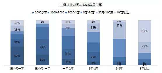 而且根据本次调研数据显示,当主播从事直播的时间越长,其粉丝积累数量越多,从业三年以上主播的粉丝数量在50万以上的占比高达84%,仅有6%为5000以下。