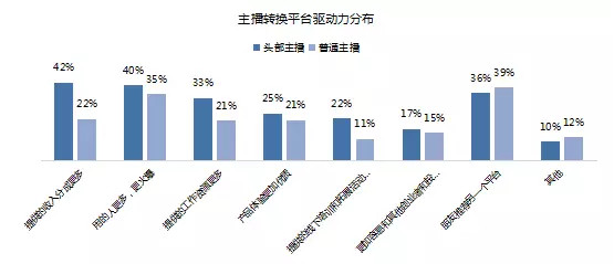 从流动性来看,整体上绝大部分主播粘性较高。但头部主播相比普通主播,流动性更高,尤其在在转换平台过程中弃用旧平台的占比22%,高出普通主播近1倍左右。