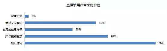 据本次调研数据显示,目前绝大部分的主播对于自身直播价值定位很明确,76%的主播认为直播的价值在于娱乐休闲,而选择情感交流需求的主播也达到41%。