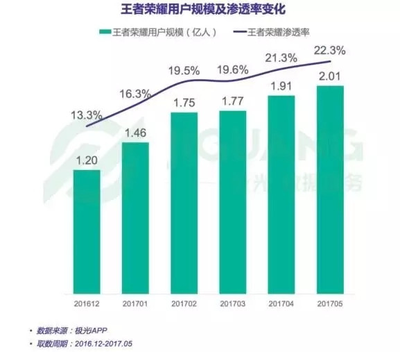 据券商中国报道,极光iAPP数据显示,截至5月最后一周,王者荣耀注册用户突破2亿,渗透率达到22.3%。这意味着,每7个中国人中就有一位《王者荣耀》注册用户,人数比A股股民还高。5月份,《王者荣耀》的DAU均值为5412.8万人,而MAU达到1.63亿人,创手游行业新纪录。