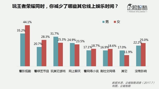 女性玩家牺牲了看影视剧(44.1%)、综艺节目(28.3%)的时间来打游戏,这可能会给整个泛娱乐生态带来更为长远的影响。
