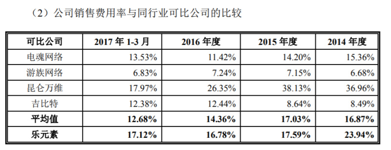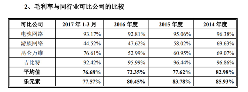 乐元素的毛利率表面看上去略高于同行业公司。招股书解释,这与公司的模式有关和会计科目计算方式有关。