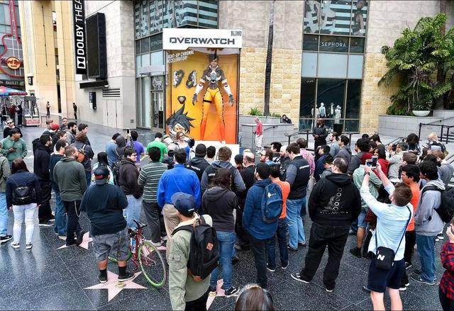 一个来自视频游戏《守望先锋》的角色在好莱坞星光大道附近与粉丝见面。