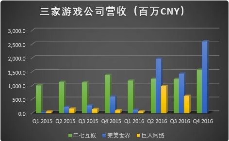 从三家游戏公司的营收可以看出,三七互娱营收一直较为稳定,且遥遥领先于完美世界和巨人网络在腾讯网易称霸的游戏业第三位只是“炮灰”。但从2016年Q2开始,完美世界和巨人网络营收骤然实现爆发式增长,前者更是连续三个月营收超过三七互娱,此次2017年上半年也同样显示这种增长趋势。