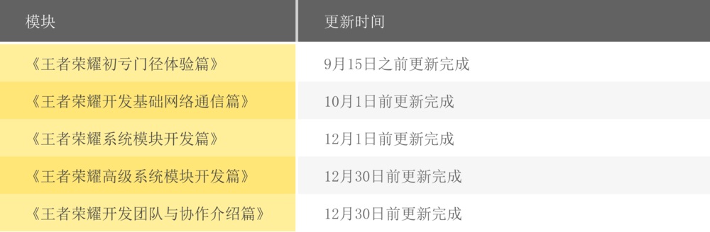 精品课程多采用“录屏教学+直播答疑”的形式。团队会将一个游戏的开发过程进行拆解,讲述开发过程的同时会为用户提供封装完成的开发模块,帮助用户更快地上手完成一款游戏的研发。精品课程会提前在平台发布进行预售,“王者荣耀”课程的内容列举如下: