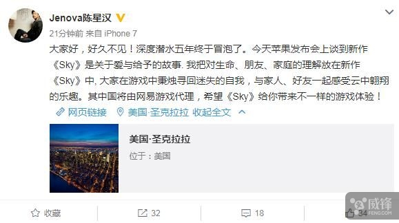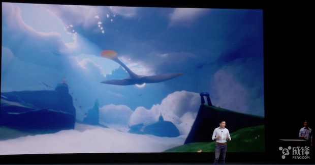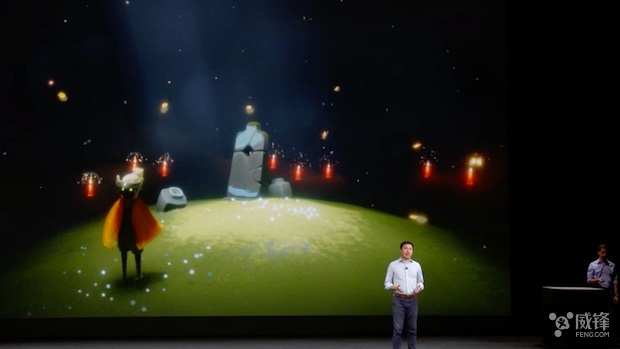 在每年发布会新品几乎都被曝光到几乎没有新曝点的时候,发布会上出现的游戏新作总能成为意想不到的惊喜。这一次发布会,陈星汉的上台最令人兴奋,他在Apple TV 的环节直接带来了自家工作室That Game Company新作《Sky》。