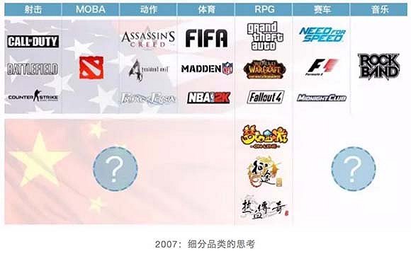 回顾2007年的市场格局和细分品类分布,中国市场的主导品类是RPG(角色扮演游戏),而反观以美国市场为代表的全球成熟游戏市场,其实品类很丰富,有体育、赛车、音乐、射击等各种不同类型。当时,摆在我们面前的一个问题就是:中国市场为什么和其他市场不同,难道是中国市场就是不同的吗?