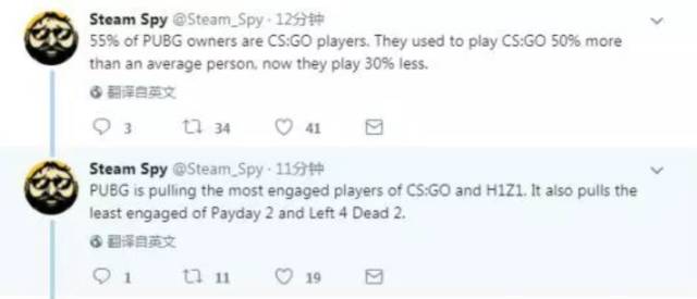 根据Steam Spy在推特上的消息,《绝地求生》55%的玩家来自于《CS:GO》玩家,这些玩家曾经在《CS:GO》上花的时间比该款游戏的平均游戏时间高出50%,但自从入坑“吃鸡”后,他们玩《CS:GO》的时间比平均游戏时间还要短30%。