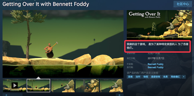 《Getting Over It with Bennett Foddy》其实有一个更为正经的译名,叫做“和班尼特福迪一起攻克难关”,但这破名字,一看就难记而且难火又是直播爆款“掘地求升”山寨手游飞快出现。于是网友们更喜欢借着吃鸡噱头叫它“掘地求升”,不过这个外号确实形象无比,而且言简意赅。该作目前还没有正式发售,主播们拿到的都是Demo 版本。根据开发商Bennett Foddy 的介绍:这是一款挫折游戏,目的不是使人快乐,而是想要验证在不能承受的接连挫折之下,玩家能坚持时长多久。
