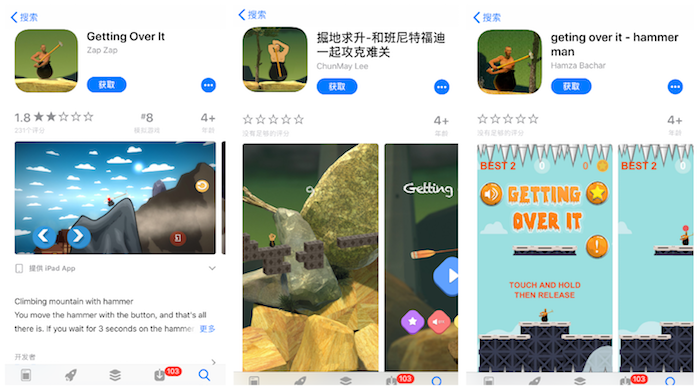 “掘地求生”火了之后,手机平台上就迅速出现了它的山寨品,目前App Store 上搜索“Getting Over It”就能看到数款手游,都有着相当代表性的App 图标,名字也和原作几乎一样,有的甚至就直接拿“掘地求升”做标题。为了适应手游玩法,还特地做了各种画面、关卡和操作上的“精简”。