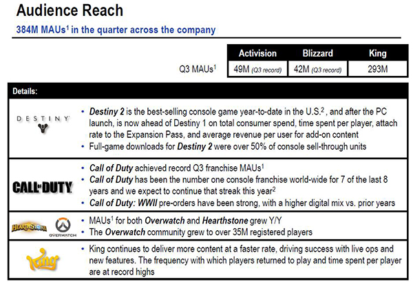 动视暴雪再次用“优于预期”来描述该季度的财务表现:动视在该季度发售的主要作品《命运2》推动总公司的净收入同比增长3%,暴雪的月活用户(monthly active players)达到4200万,《守望先锋》目前注册玩家数已经超过3500万,另外King的《糖果粉粹传奇》回到了美国App Store畅销榜首位。