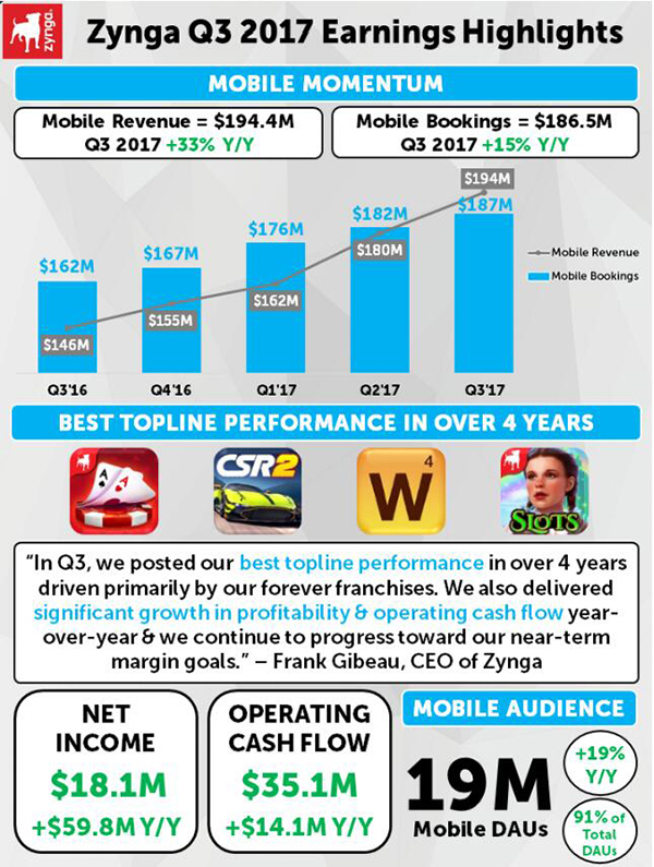Zynga实现了2011年IPO之后连续两个季度均有盈利,而对于第四季度的收入预期也意味着2017财年或将成为该公司有史以来第一个盈利的完整年度。《Zynga扑克》以及《CSR赛车2》带来的收入增长、新发售的《与好友一起玩接龙2》以及1亿美元收购了土耳其游戏发行商Peak Games公司旗下的卡牌工作室等都预示着Zynga的强劲表现还将持续至2018年海外游戏大厂最新财报解析:收入市值增幅惊人。