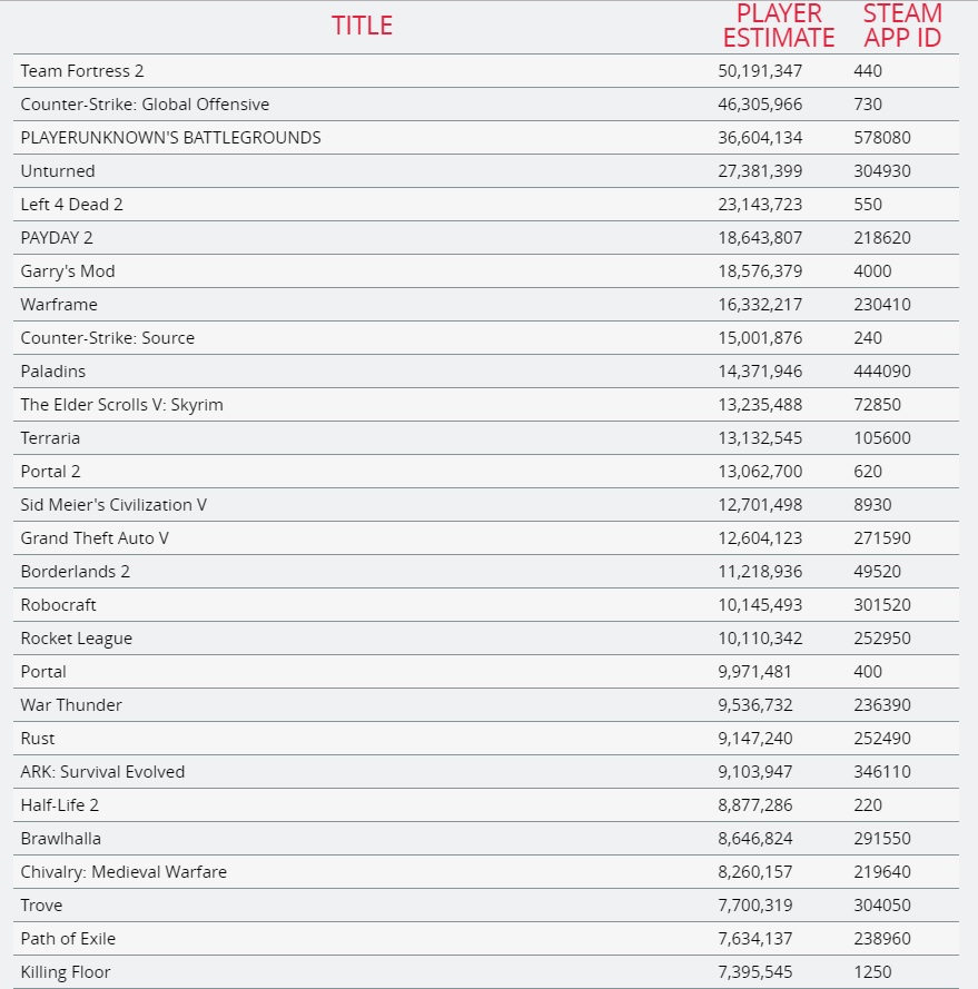 Valve近日似乎泄露了Steam平台上当前所有游戏各自的玩家总数。Valve的API最近被挖出了一个漏洞,用户可以借此算出非常精确的数据,并对应到Steam上游戏的玩家数。