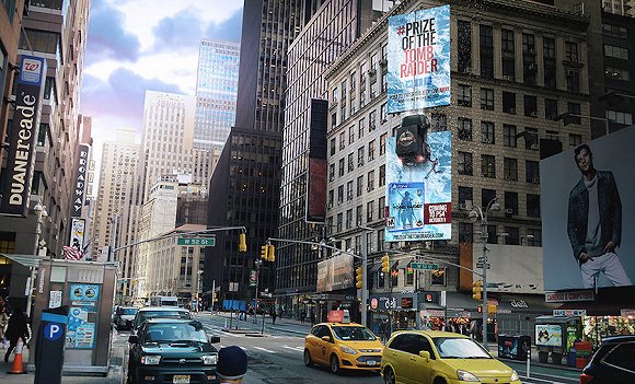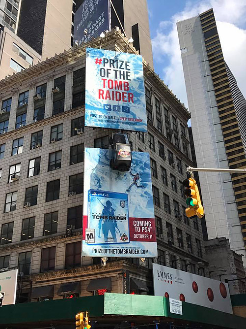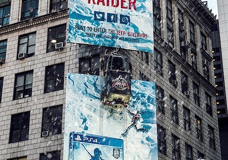 《古墓丽影》游戏的粉丝们看到大概会心一笑:这辆牧马人正是游戏女主角劳拉开的越野车,而这冰天雪地的环境设定也很符合《古墓丽影》游戏的探险特质。广告的创意方Liquid Advertising也表示,之所以砸重金设计这块广告牌,是为了把游戏中的环境代入到现实生活中,让人们更身临其境:“游戏中劳拉必须在各种严酷环境中生存,这辆在悬挂在时代广场墙面上的吉普,应该也只有劳拉能爬的上去吧《古墓丽影:崛起》做宣传让纽约时代广场下起大雪。”
