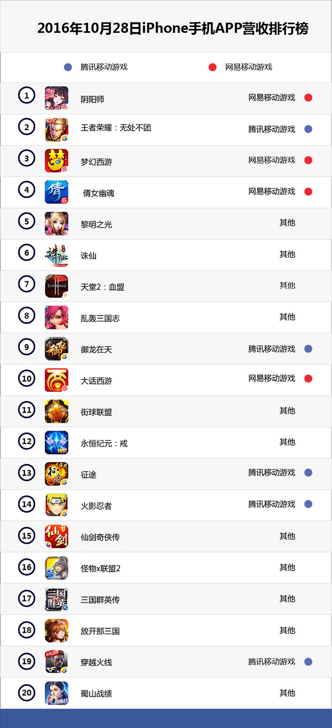 网易继9月份交出亮丽数据之后,10月份进一步巩固其在中国重度手游市场霸主地位,整个月度自始至终牢牢占据iOS手机游戏App营收排行榜前5位中的3个席位。