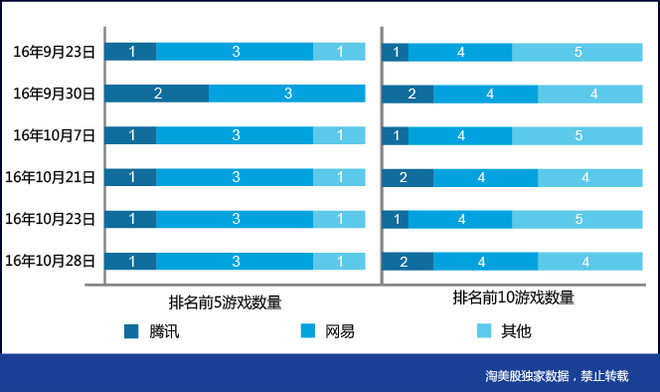 根据监测数据统计分析,2016年9月23日至10月28日,苹果iOS商店中国大陆手机游戏营收排行TOP 50中,网易平均占据席位依然保持在5个,除了之前介绍的4款游戏之外,另有《天下》进入榜单。腾讯在TOP 50中的席位,依然比较尴尬,虽然较之前最低点10个席位有所回升,但也只能平均保持在12个左右,较之前18至20个席位的巅峰期下降明显网易手游优势进步巩固腾讯业绩翻身难靠游戏。