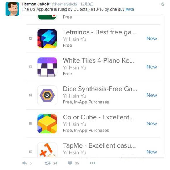 苹果对这种异常情况是什么态度呢?记者看到,1天以后这些游戏已不在美国免费榜上某中国公司在美国iOS免费榜刷出“七星连珠”。但如此多的游戏同时被刷到美国免费榜这样的高位,也说明了一些事:美国区免费榜榜单防作弊手段远比中国区要弱的多,另外,中国公司刷榜能力真叫独步全球。