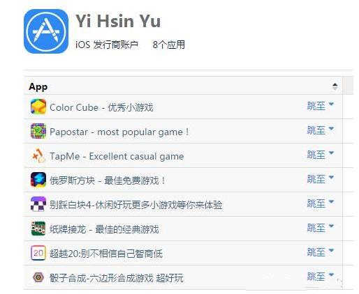 这多款休闲小游戏都来自名叫YiHsinYu的开发者,这个开发者ID很容易猜到是中国开发者的帐号,实际检查也会发现游戏都有中文名,更是确认了是国内同行某中国公司在美国iOS免费榜刷出“七星连珠”。