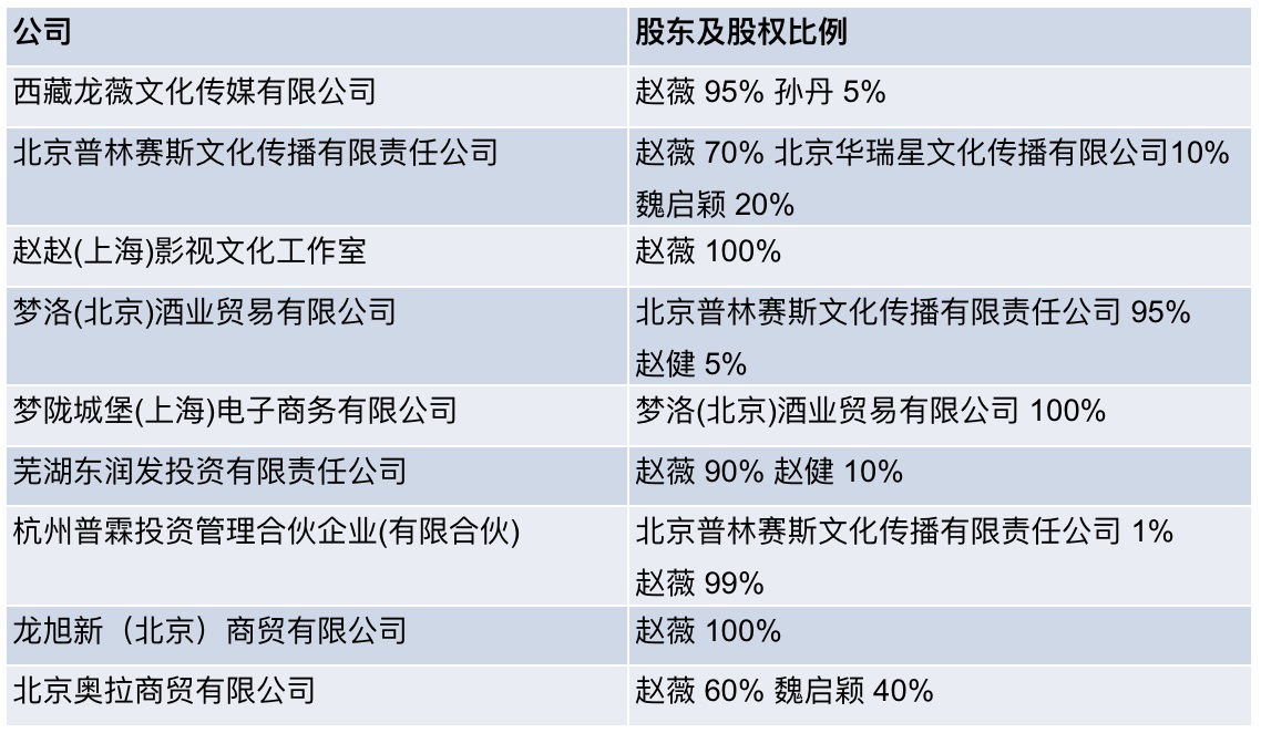 除上述两家公司外,赵薇为控股股东、实际控制人所控制的核心企业有如下9家。